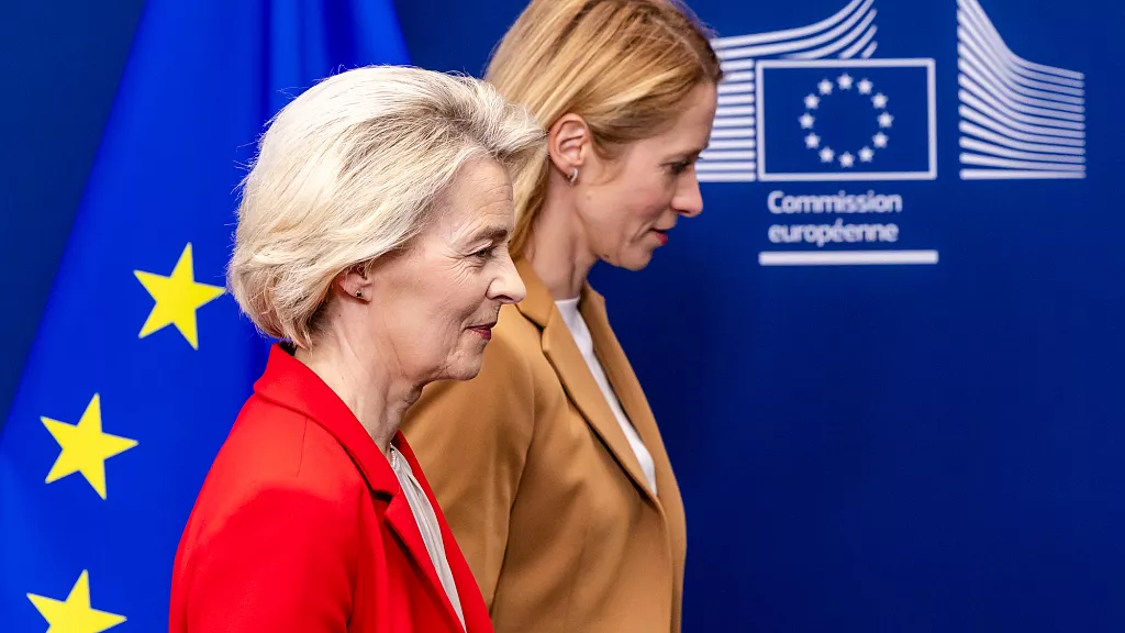 Председатель Европейской комиссии Урсула фон дер Ляйен (слева) и глава внешнеполитического ведомства Европейского союза Кая Каллас покидают пресс-конференцию в штаб-квартире ЕС в Брюсселе.