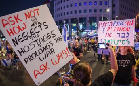 Тысячи людей собрались в воскресенье вечером у офиса Нетаньяху в Иерусалиме. В Тель-Авиве родные заложников прошли с гробами, символизирующими погибших.
