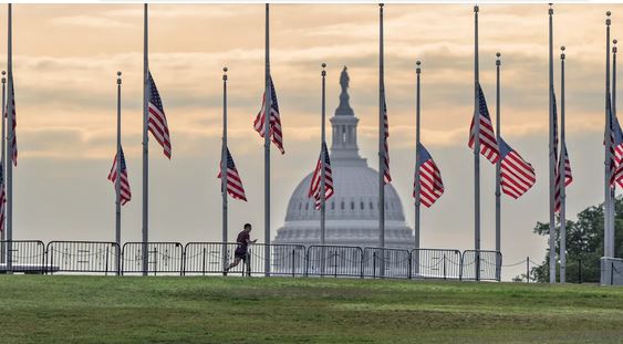 Флаги вокруг памятника Вашингтону были приспущены в Вашингтоне в четверг, 28 августа 2025 года, после стрельбы в католической церкви в Миннеаполисе.