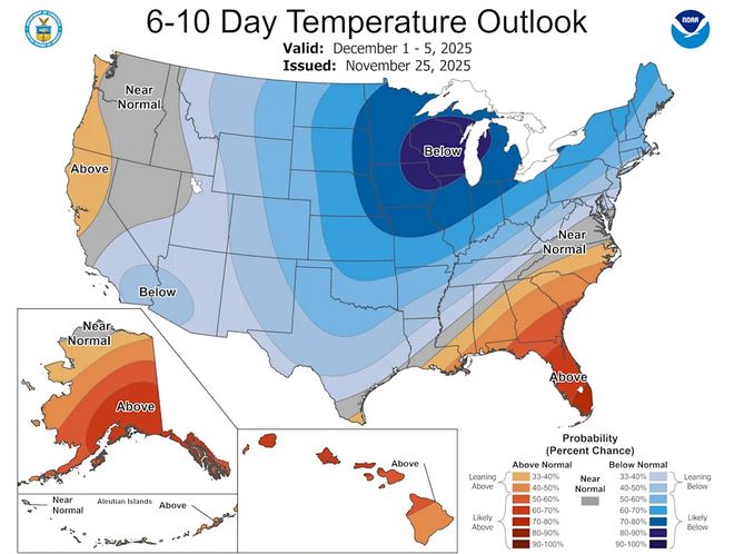 Хотя самые экстремальные холода наступят только в конце декабря, на следующей неделе на обширной территории страны от западных Высоких равнин до Восточного побережья можно ожидать повсеместной и устойчивой температуры ниже нормы для этого времени года. В юго-восточных штатах будут некоторые условия, близкие к нормальным, а над Флоридой станет теплее, сообщает Национальная метеорологическая служба.