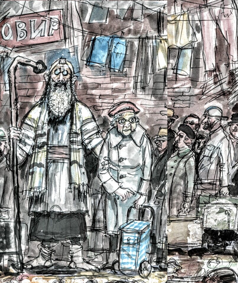 Очередь медленно двигалась справа налево, куда указывала стрелка с надписью ОВИР, а над их головами на бельевых верёвках, натянутых под разными углами в несколько рядов висело, как на просушку, белье: рубашки, трусы, кальсоны с жёлтыми разводами, штопаные женские панталоны, чулки и наволочки. Наверху в центре –экран, на нем, через проектор демонстрировались картинки из еврейской жизни. Впереди на краю сцены в образе старого еврея, с огромной бородой и пейсами, в талесе с тфилином на лбу и посохом в правой руке стоял Сеня Соркин.