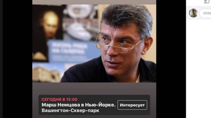 В Манхеттене , в Ва́шингтон-Сквер-парк (Washington Square Park) 24 февраля 2019 года – марш памяти российского политика, убитого в Москве рядом с Кремлем в спину –Бориса Немцова.