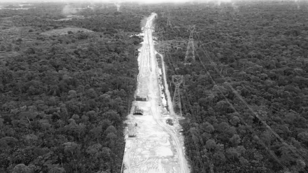 Вдоль частично построенной дороги по обе стороны возвышаются пышные тропические леса — напоминание о том, что было здесь когда-то. Бревна сложены высокими штабелями на расчищенной земле, которая тянется более чем на 13 км (8 миль) через тропический лес в Белен.