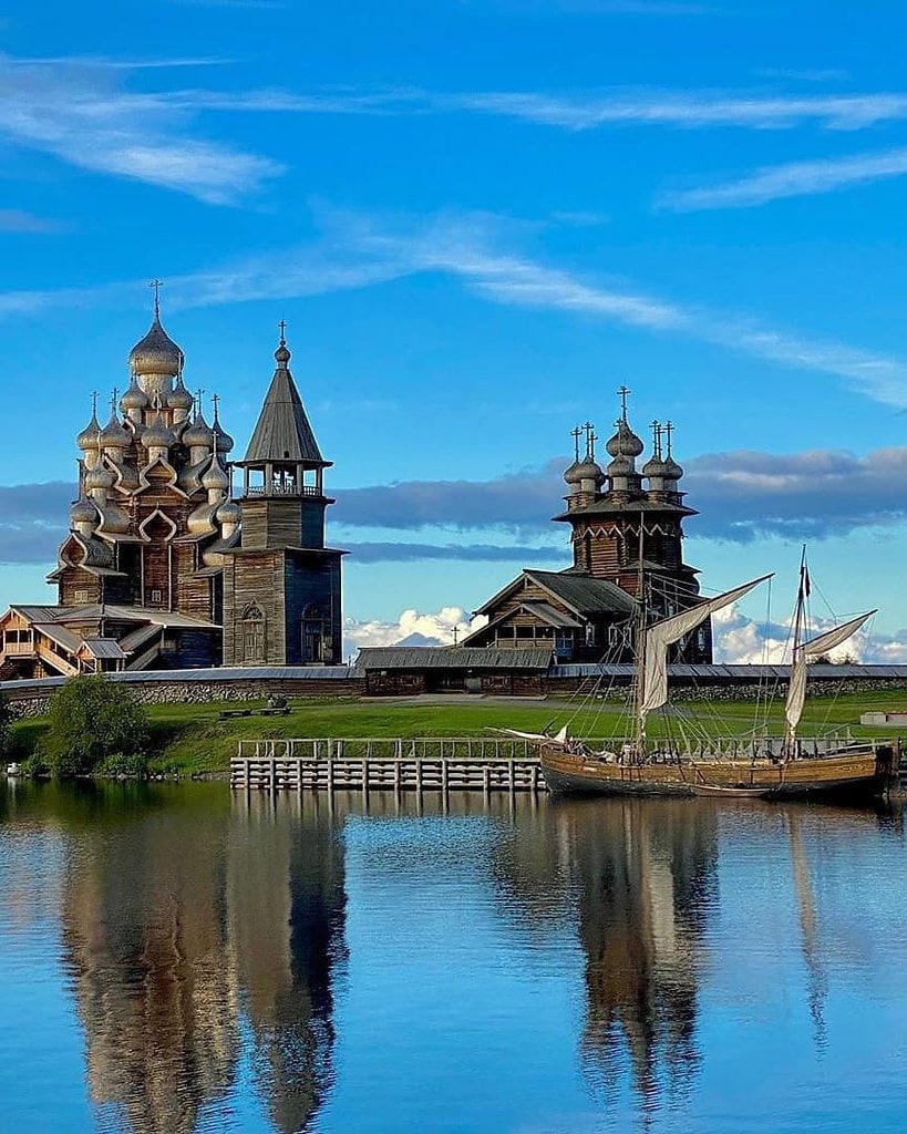 Церковь Преображения Господня. Жемчужина архитектурной коллекции Кижей. Храм был возведен еще в 1714 году на месте ранее сгоревшей от удара молнии церквушки. Все 22 маковки куполов сделаны из осиновых чешуек, из-за чего создается впечатление, что купола облиты серебром. Внутри вы можете увидеть множество позолоченных икон, фресок, резных украшений и многое другое. К храму также пристроена трапезная, которая по красоте ничуть не уступает самой церкви.
