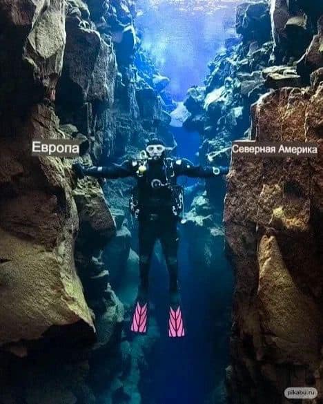 Это не просто какая-то трещина в подводной скале, а место стыка Евразийской и Северо-Американской тектонических плит. То есть дайвер на фотографии одновременно касается руками двух континентов.
