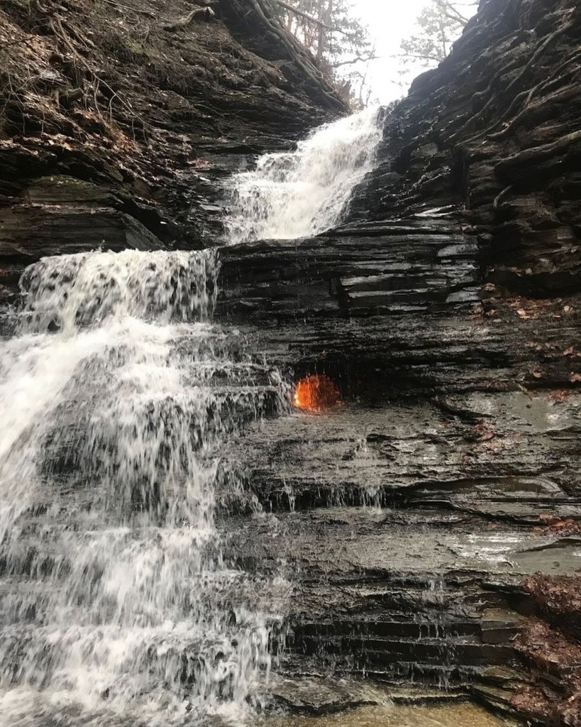 Но большинство туристов сюда едут не из-за каштанов. Парк может похвастаться большим разнообразием сланцевых скал, по которым стекают ручьи, образуя небольшие водопады. Одним из самых известных и необычных считается Водопад Вечного огня (Eternal Flame Falls).