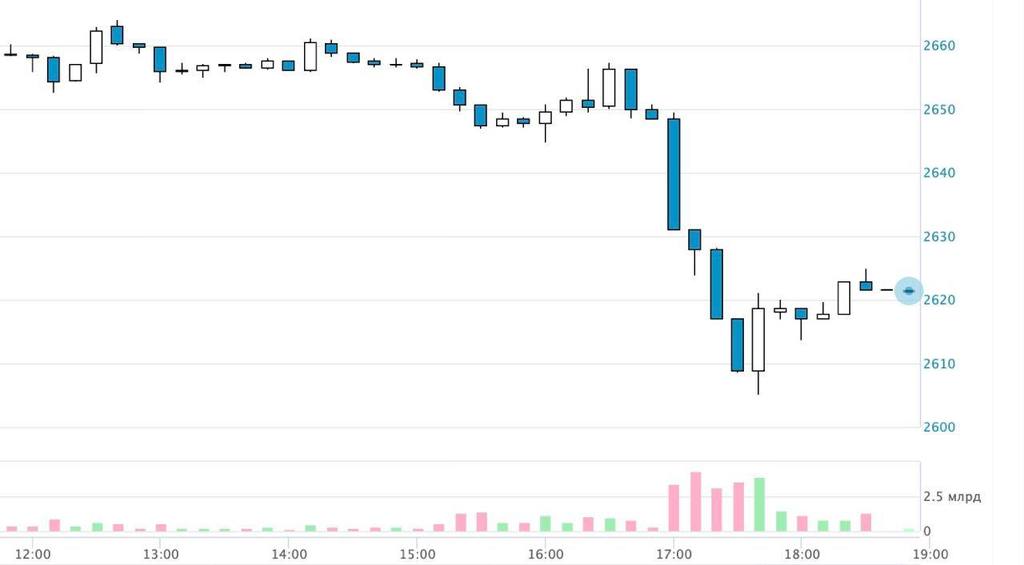 Индекс Мосбиржи по итогам основной сессии в четверг снизился на 1,76% (рекордно с 27 октября), до 2621,3 пункта, и потерял более 100 млрд рублей капитализации. На 22.07 мск акции Сбербанка и «Роснефти» подешевели на 1,6%, «Газпрома» — на 1,9%, «Совкомфлота» — на 1,7%, «Новатэка» — на 2%, «Норникеля» и «Аэрофлота» — на 2,7%.
