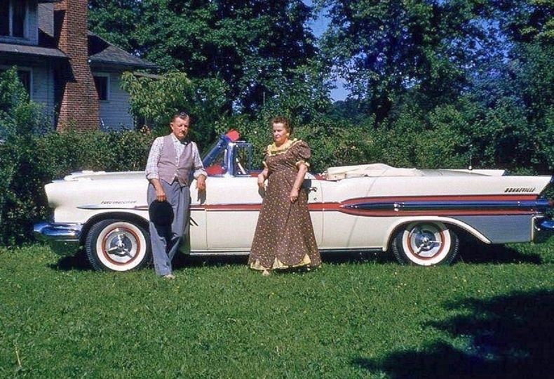 Винтажный кодахром счастливых обладателей редкого кабриолета Pontiac Bonneville Convertible 1957 года.