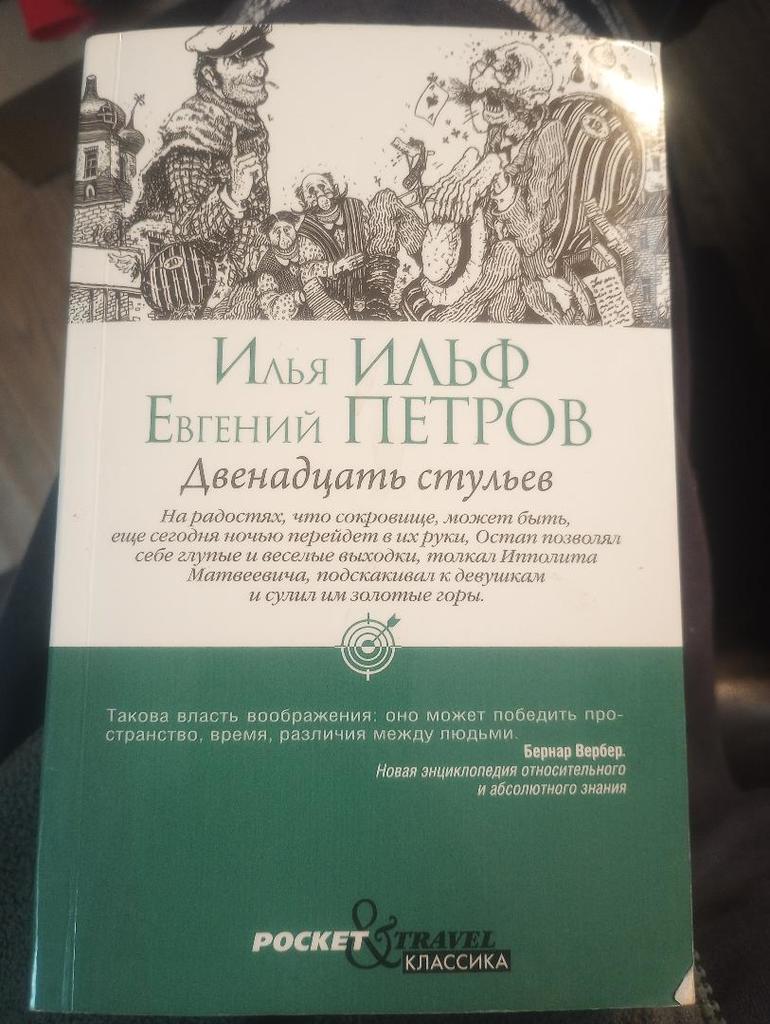 Приключенческий роман, являющийся первой совместной работой Ильи Ильфа и Евгения Петрова. Главный герой – Ипполит Воробьянинов узнает от умирающей тёщи, что в одном из 12 стульев старинного гарнитура спрятаны бриллианты. Он и его неожиданный авантюрный спутник Остап Бендер отправляются на поиски сокровищ. Стулья постоянно перемещаются, ускользая из рук напарников и оказываясь в самых неожиданных местах.