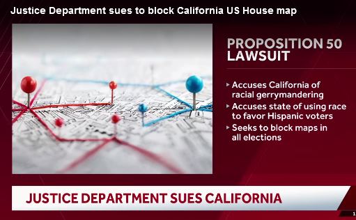 Министерство юстиции присоединяется к иску, оспаривающему новую карту, поданному Республиканской партией Калифорнии на прошлой неделе. Администрация Трампа обвиняет Калифорнию в расовом джерримендеринге, нарушающем Конституцию, путем использования расового фактора в качестве фактора для предоставления преимущества испаноязычным избирателям при выборе новой карты. Она просит судью запретить Калифорнии использовать новую карту на любых будущих выборах.