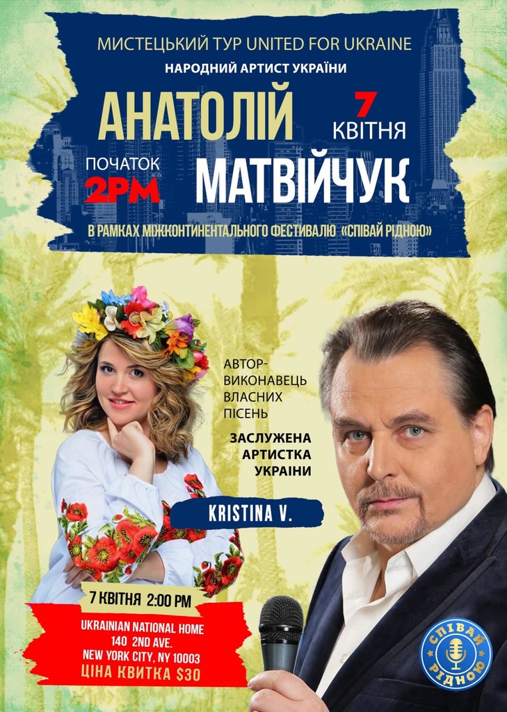 7 квітня у Нью-Йорку зі своїм концертом виступить Анатолій МАТВІЙЧУК, відомий український співак, поет, композитор, Народний артист України. Це буде виступ у рамках всеамериканського туру «Співай рідною» на підтримку України та її героїчної боротьби проти російського агресора.