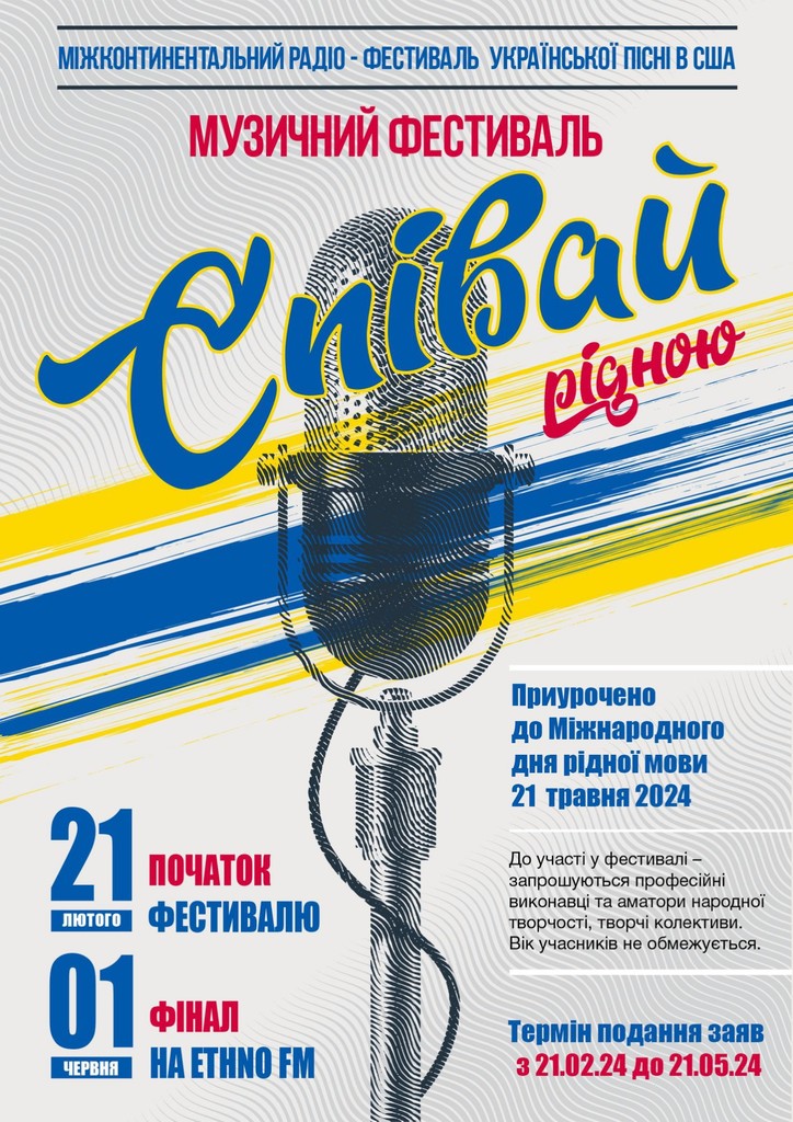 Міжконтинентальний радіо фестиваль української пісні в Сполучених Штатах Америки - «СПІВАЙ РІДНОЮ» заснований Мистецькою пісенною програмою «Час української пісні» на - Ethno Fm Radio California USA. Ротація фестивальних пісень на - Ethno Fm Radio розпочинається з 21 лютого і триватиме до 1 червня 2024 року.
